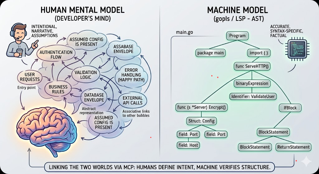 Before we dive into the configuration details of setting up gopls as an mcp server for Gemini-CLI, we have to know how a (remote) AI Large Language Model can successfully interact with your codebase. By default, these types of console tools like Gemini-CLI and Claude code, simply “read your code” the same way as a human developer does. We read some code, see some objects and structs having functions decorated on it, and then we dive into the interface definitions and lookup where these funcs and methods are being called from, to understand the “flow of the program” and make a mind model of that in our heads.